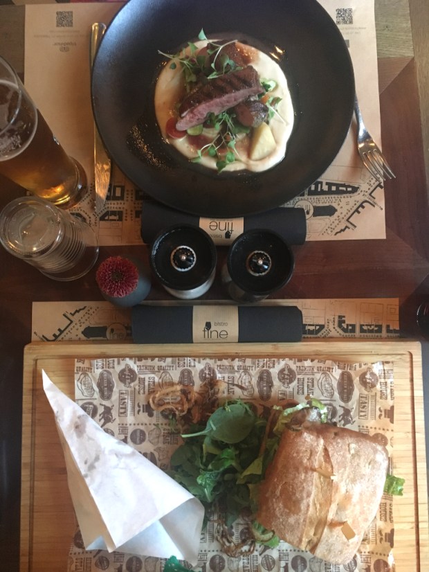 Das „Bistro Fine“ ist vielleicht einen kleinen Tick schicker als alle anderen Restaurants, in den wir essen waren. Auf dem Tisch liegen Stoffservietten mit Banderole, die Wanddekoration ist zurückhaltend modern. Aber keine Sorge: Auch in Jeans und Turnschuhen ist man gern gesehener Gast. Zumindest hat man uns genau so behandelt. Der Service war wirklich erstklassig. Das Essen ebenfalls. Die Karte ist klein, die Auswahl trotzdem schwer, weil alles so gut klingt. Schließlich landeten ein Pulled Duck Burger und Rinderfilet auf Pastinakenmus auf unserem Tisch. Wir haben’s nicht bereut!